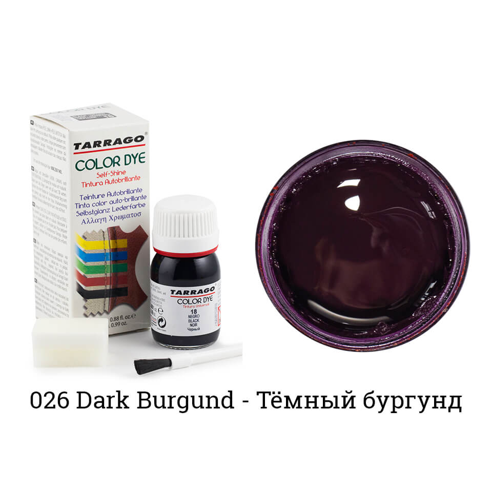 Tarrago Color Dye — один из самых популярных продуктов для покраски обуви, сумок и кожаных курток. Продукт представляет из себя жидкое красящее вещество на водно-восковой основе, с огромным выбором цветов. В комплект входит кисточка для нанесения. Принцип работы — укрывной. Это означает что на поверхности материала образуется тончайшая пленка. При этом кожа остается мягкой и не теряет своих свойств.